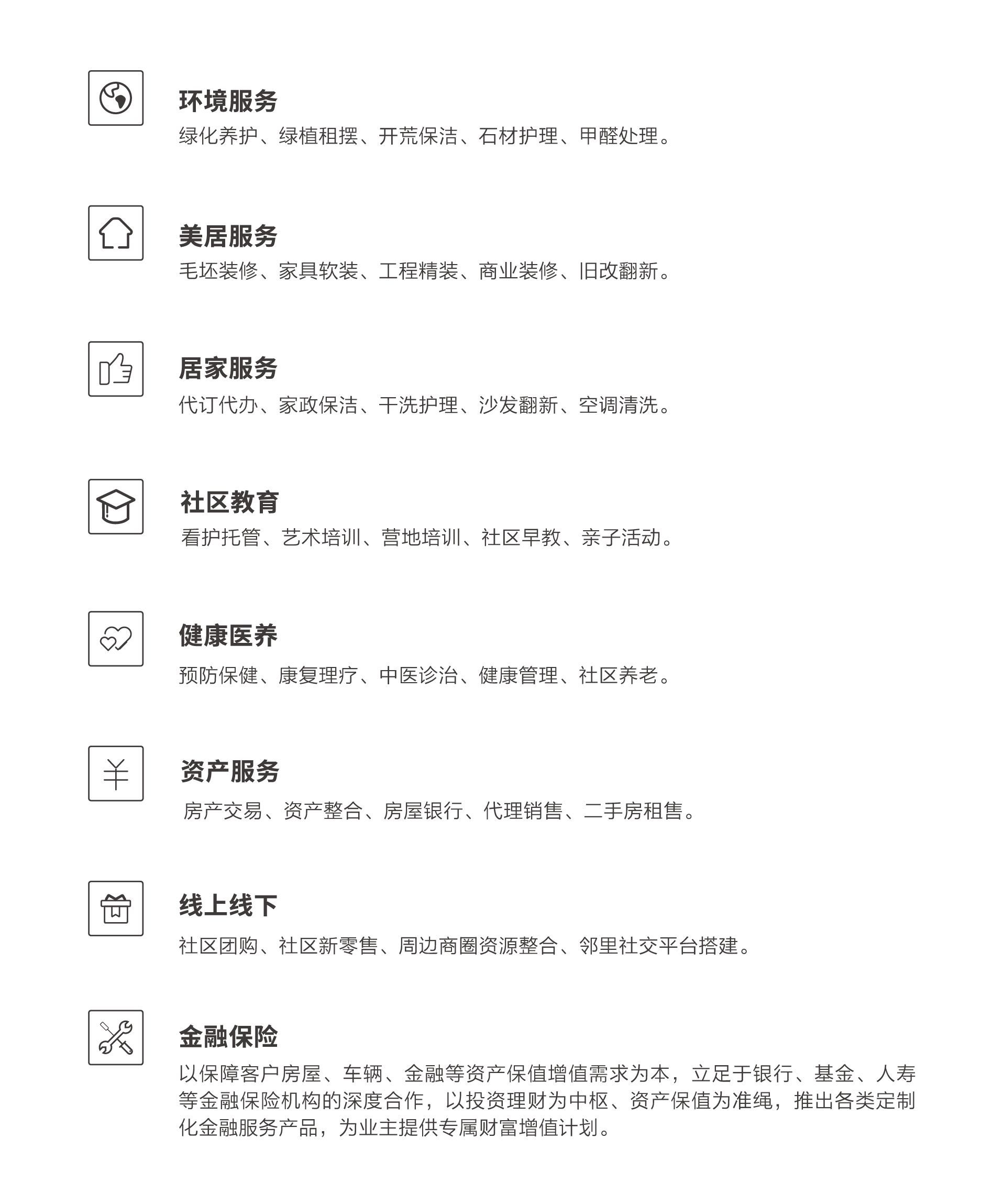 方圆现代生活开展集环境服务、美居服务、居家服务、社区教育、健康医养、资产服务、金融保险等为一体的线上线下社区增值服务,让住户享受到一站式、全生态的社区配套服务,打造具有幸福感的社区生活。